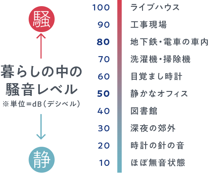 例えば、電車の車内は80dB、地下鉄ですと100dBほどあります。