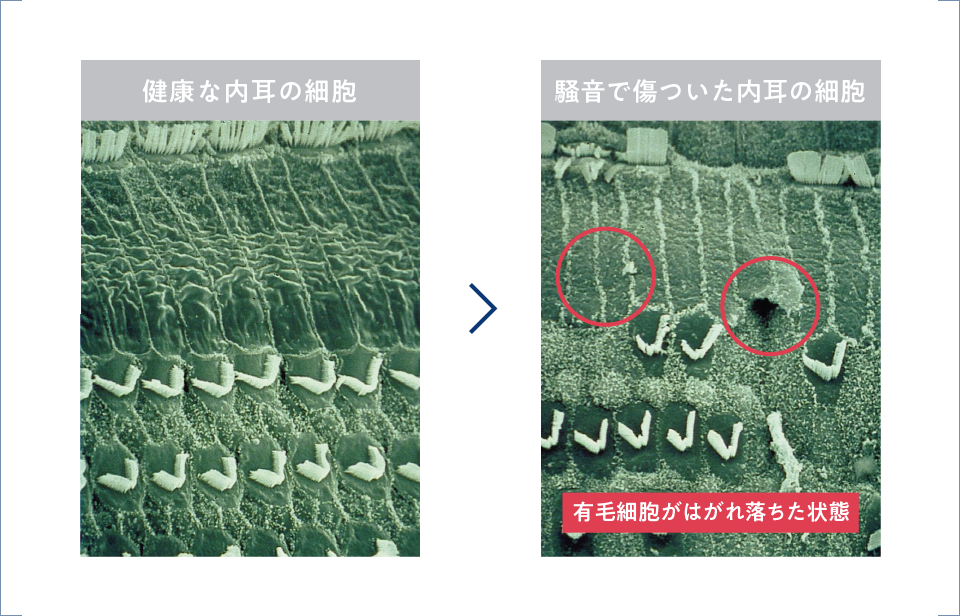 騒音で傷ついてしまった内耳の細胞は、元には戻りません!若い頃から日頃のケアが大切です。